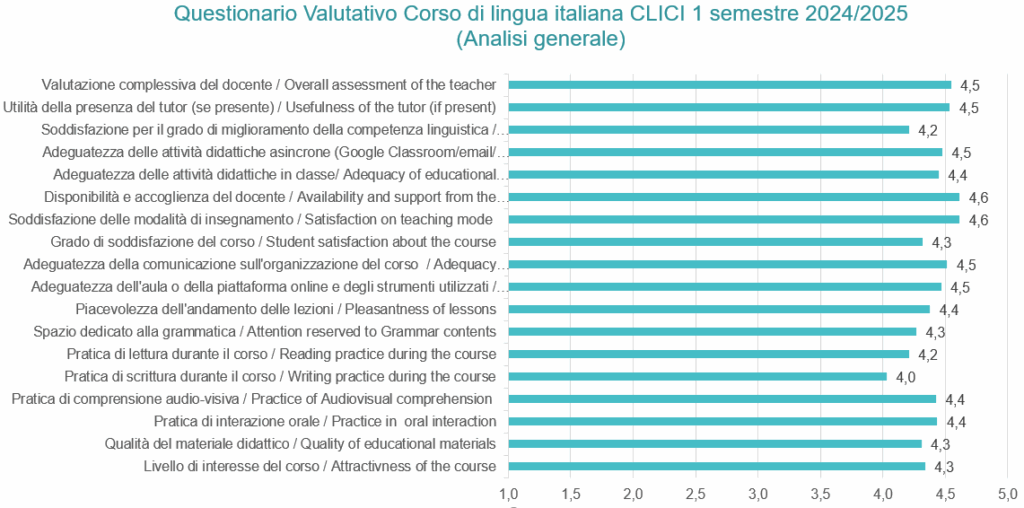 Il questionario, compilato in modo anonimo e individuale da 101 studenti, ha permesso di raccogliere preziosi feedback sul Corso di lingua e cultura italiana offerto dal CLICI nel 1° semestre dell’anno accademico 2024/25, contribuendo a un’analisi approfondita delle loro impressioni e valutazioni.