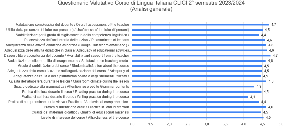 Il questionario, compilato in modo anonimo e individuale da 124 studenti, ha permesso di raccogliere preziosi feedback sul Corso di lingua e cultura italiana offerto dal CLICI nel 2° semestre dell’anno accademico 2023/24, contribuendo a un’analisi approfondita delle loro impressioni e valutazioni.